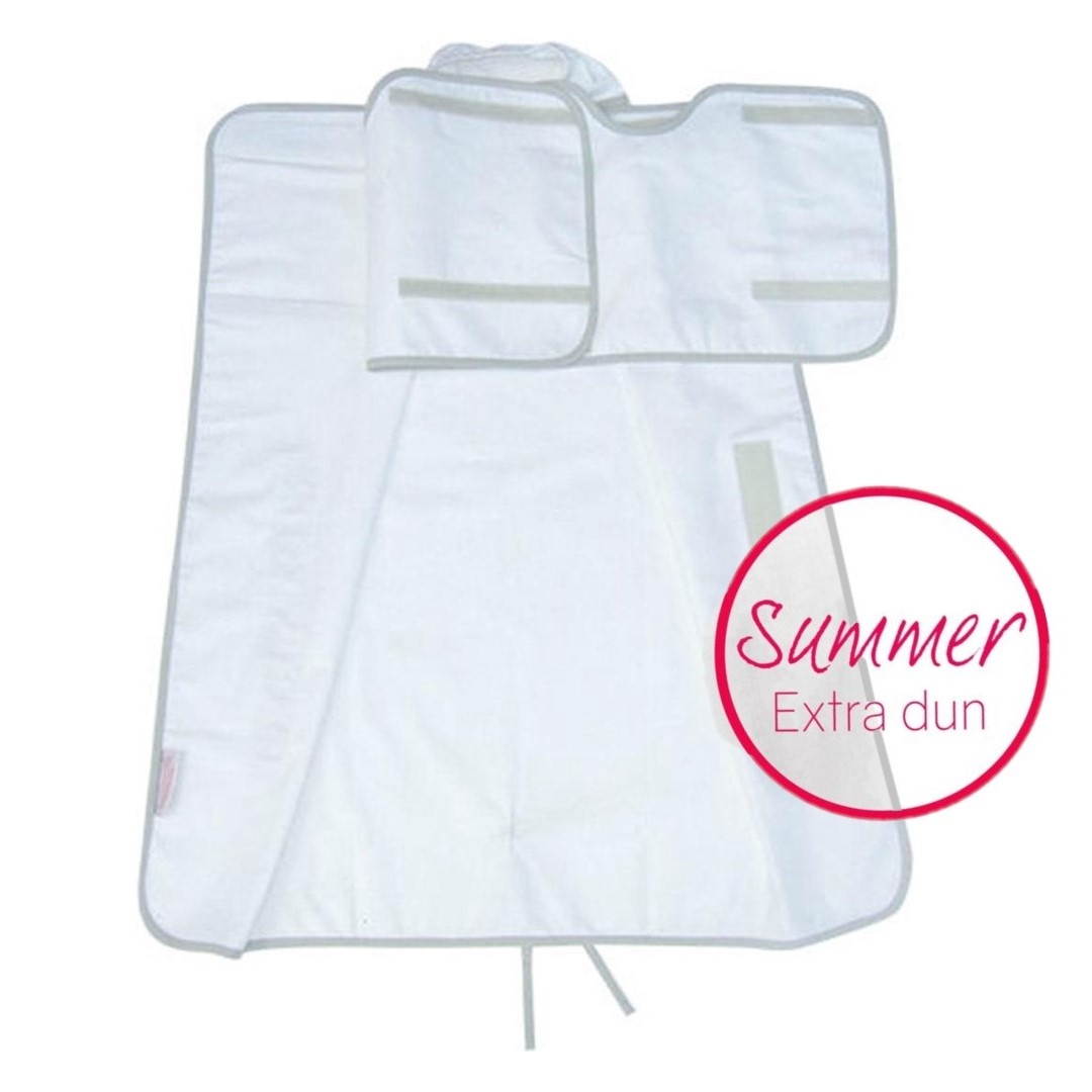 De Summer afbouwdoek is er in één maat, het is een ‘vanaf’ maat, dat betekent, dat zodra je de eerste arm van je baby vrijlaat, er meer ruimte in de doek ontstaat wat ook weer van invloed is op de pasvorm.